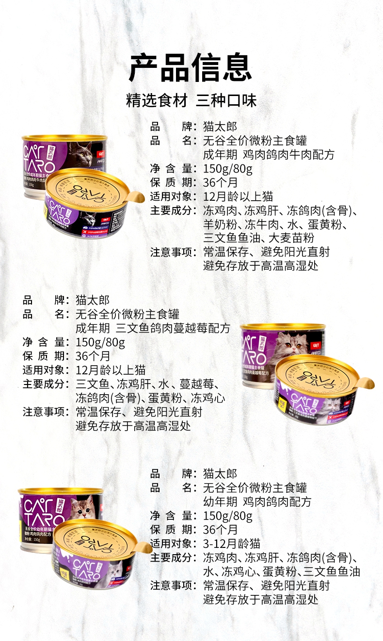 猫太郎鸽肴无谷主食罐:主食材是更鲜更有营养的鸽肉,超过95%的含肉量,开盖满满全是肉泥,需要补水的话也可以另外和水喂。